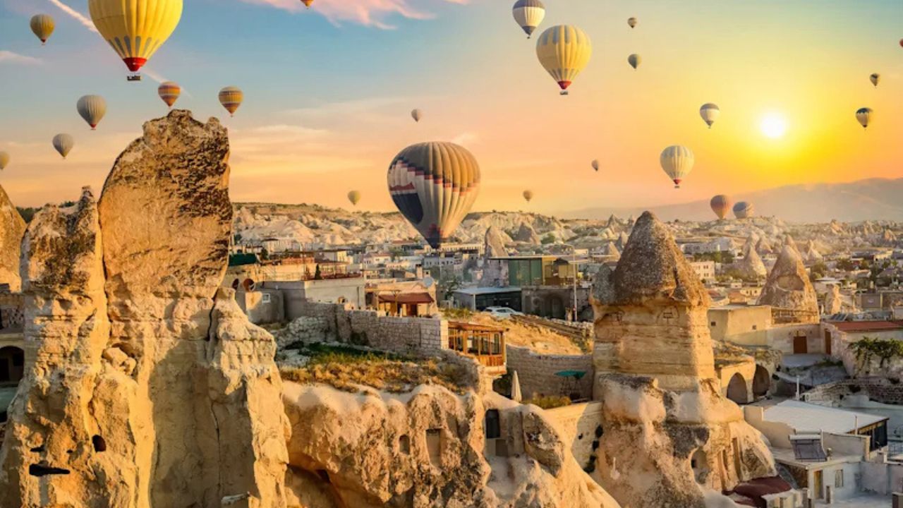 This image captures a breathtaking sunrise over Cappadocia’s unique volcanic landscape. The scene features numerous colorful hot air balloons floating above the region’s famous “fairy chimneys” — tall, cone-shaped rock formations created by volcanic eruptions and erosion over thousands of years.