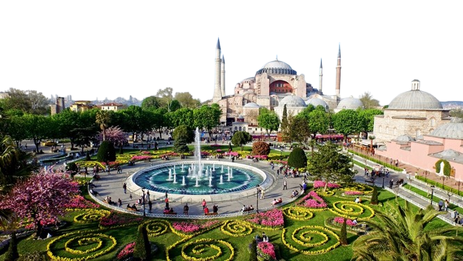 This image shows the beautiful skyline of Istanbul, Turkey. In the foreground, ferries can be seen moving across the water, while historic buildings fill the city behind them. The central landmark in the image is the majestic Süleymaniye Mosque, a masterpiece of Ottoman architecture. The blue sky, greenery, and historic atmosphere make this view truly stunning and timeless.